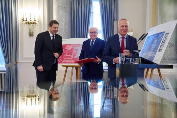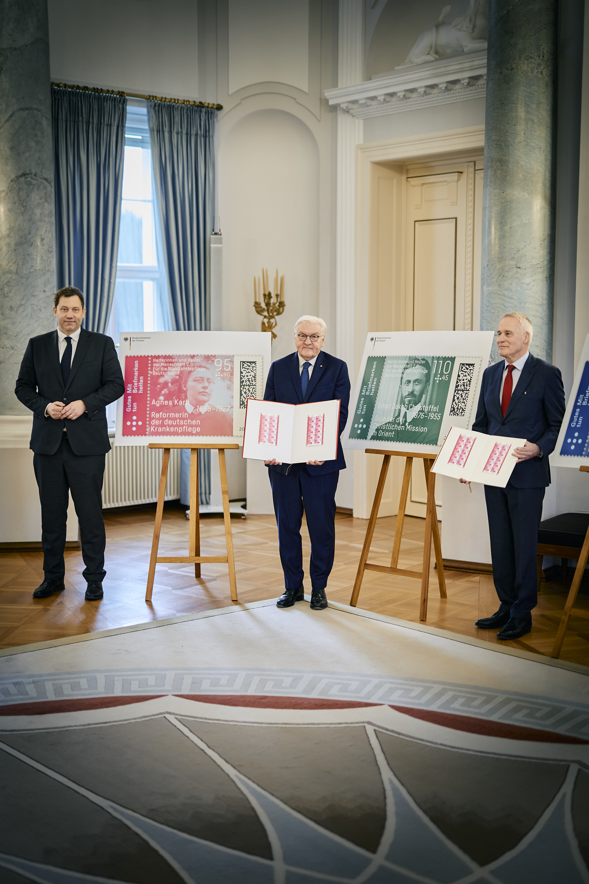 Mit diesem Statement hat Bundespräsident Frank-Walter Steinmeier die Bedeutung des Sozialwerkes Wohlfahrtsmarken – auch und gerade in der heutigen Zeit – eindrucksvoll unterstrichen. Als Schirmherr hat er aus der Hand des Bundesfinanzministers Lars Klingbeil die Erstdrucke der diesjährigen Marken entgegengenommen. Ein weiteres Album hat Bundesminister Klingbeil an Achim Meyer auf der Heyde überreicht, den amtierenden Präsidenten der Bundesarbeitsgemeinschaft der Freien Wohlfahrtspflege e. V., an die die Erlöse aus dem Verkauf der Marken gehen.